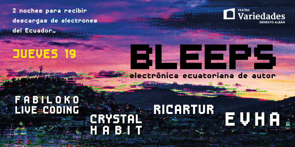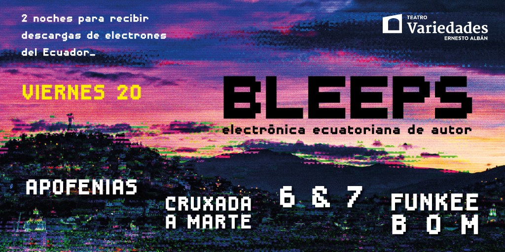 Dic 19 Bleeps, Festival de Electrónica Ecuatoriana de Autor 1 7:00 PM - 10:30 PM Teatro Variedades Plaza del Teatro, Quito Detalles de Evento Cómo llegar
