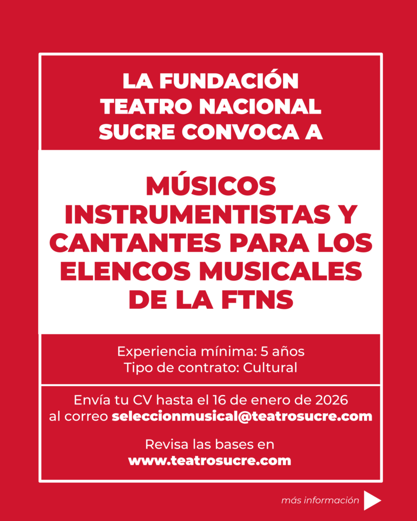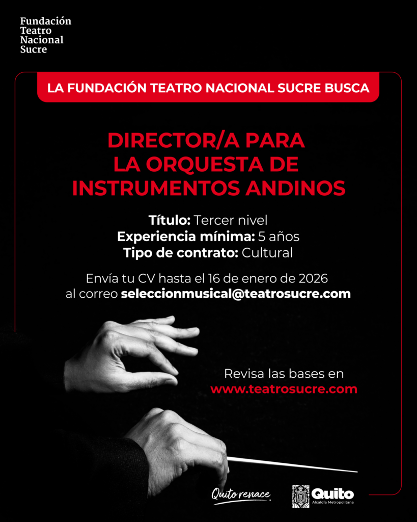 La Fundación Teatro Nacional Sucre convoca a músicos y músicas profesionales con experiencia en dirección orquestal, interpretación de instrumentos andinos, conocimiento de la música andina y gestión de procesos artísticos, a participar en el proceso de selección para el cargo de Director/a de la Orquesta de Instrumentos Andinos (OIA).