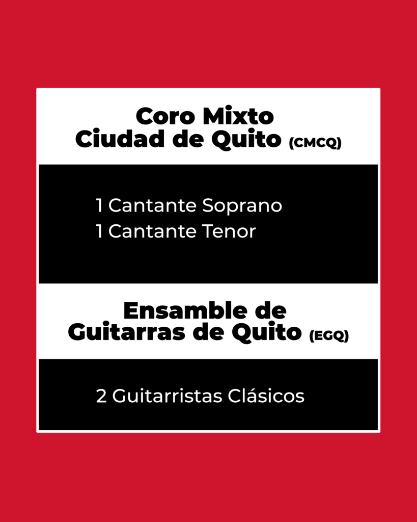Los elencos musicales de la Fundación Teatro Nacional Sucre —la Orquesta de Instrumentos Andinos (OIA), la Banda Sinfónica Metropolitana de Quito (BSMQ), el Coro Mixto Ciudad de Quito (CMCQ) y el Ensamble de Guitarras de Quito (EGQ)— realizan un trabajo artístico integral que articula excelencia profesional, formación continua y vinculación con la comunidad. Su quehacer está orientado a la difusión de la música ecuatoriana, latinoamericana, académica y contemporánea en escenarios locales, nacionales e internacionales.